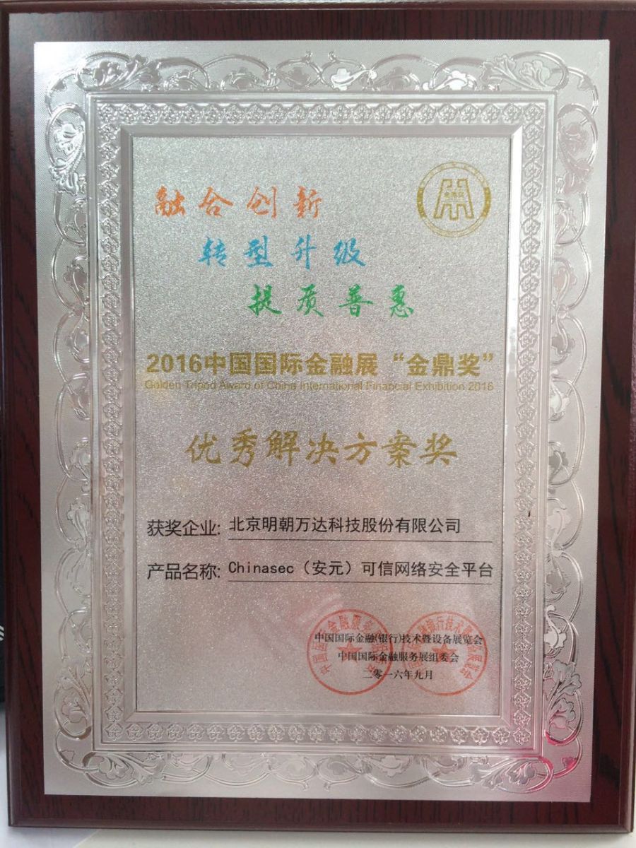 近日,2016中国国际金融展“金鼎奖”获奖名单新鲜出炉。新一代信息安全服务厂商明朝万达凭借金融领域数据安全防护硬实力,再次斩获“金鼎奖”,公司自主研发的Chinasec(安元)系列安全产品,五度荣获“优秀解决方案奖”,其金融数据安全服务能力可见一斑。