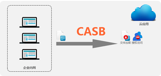 云访问安全代理(CASB)部署在企业内网和云应用之间,监测发往云端的网络流量、对隐藏在其中的敏感数据进行加密、脱敏或阻断处理,同时能够对访问云应用的行为进行识别和授权认证,保证云端数据始终处于安全状态。