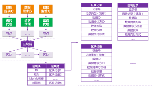 数据供需双方依托区块链基础设施,凭借数据监管方颁发的可信证书加入大数据共享与交易联盟网络。数据提供方发布数据描述信息到区块链。数据需求方从区块链获取数据提供方发布的数据描述信息,选择目标数据,发布数据权限请求到区块链。数据提供方从区块链获取数据需求方发布的数据权限请求,按照特定规则进行权限批复,将权限批复结果发布到区块链。数据需求方的数据访问请求经请求代理发送到数据提供方的访问代理,如果认证通过,则可以访问大数据中心数据。数据监管方作为区块链节点加入网络,同步区块链所有数据块,对大数据共享与交易进行监管。