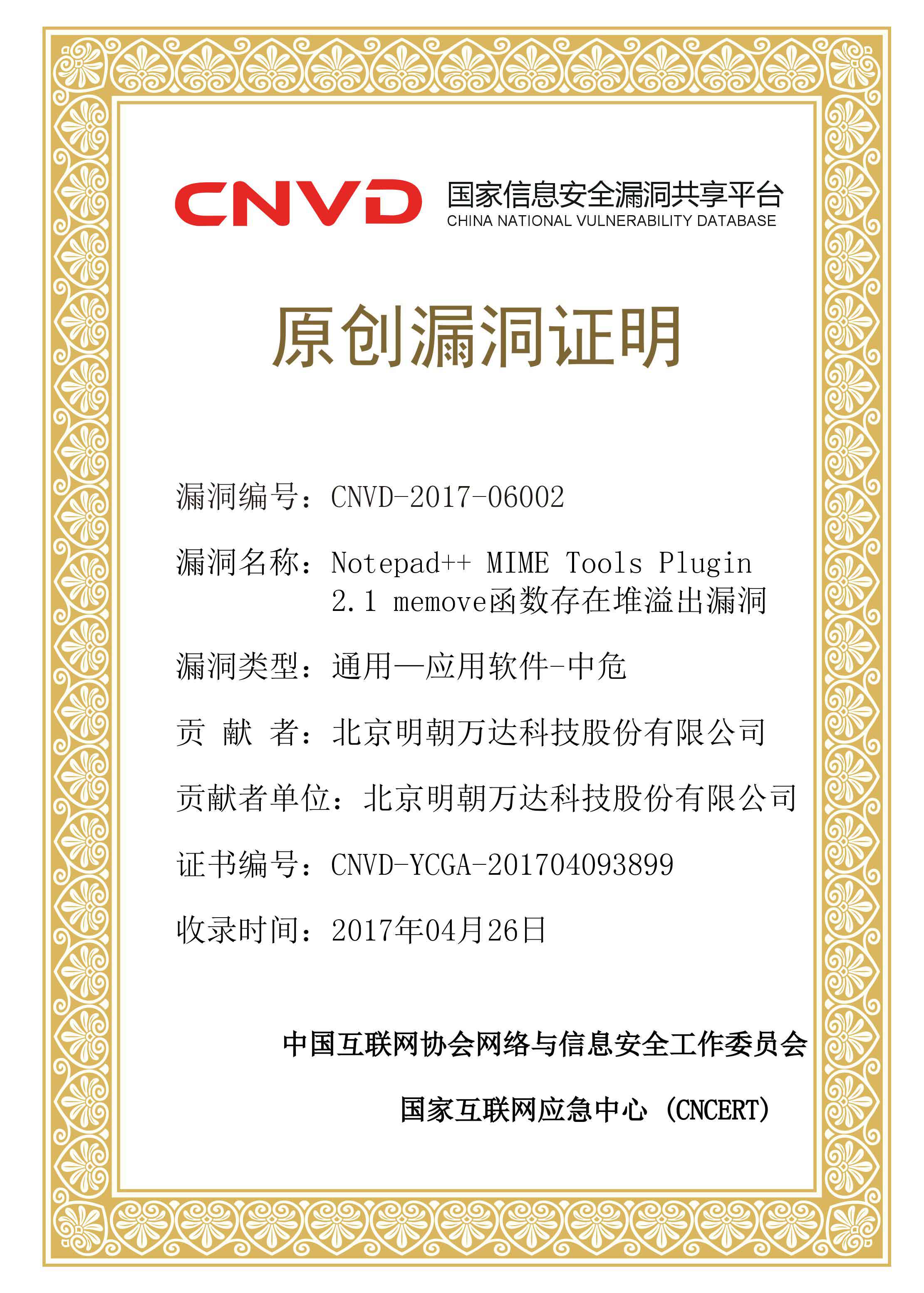 6月12日,明朝万达安元实验室发布在软件漏洞挖掘领域的重大科研成果:“Notepad++ MIME Tools Plugin 2.1 memove函数存在堆溢出漏洞”原创漏洞证明。该证明获中国互联网协会网络与信息安全工作委员会、国家互联网应急中心 (CNCERT)认可,并在国家信息安全漏洞共享平台(CNVD)发布。