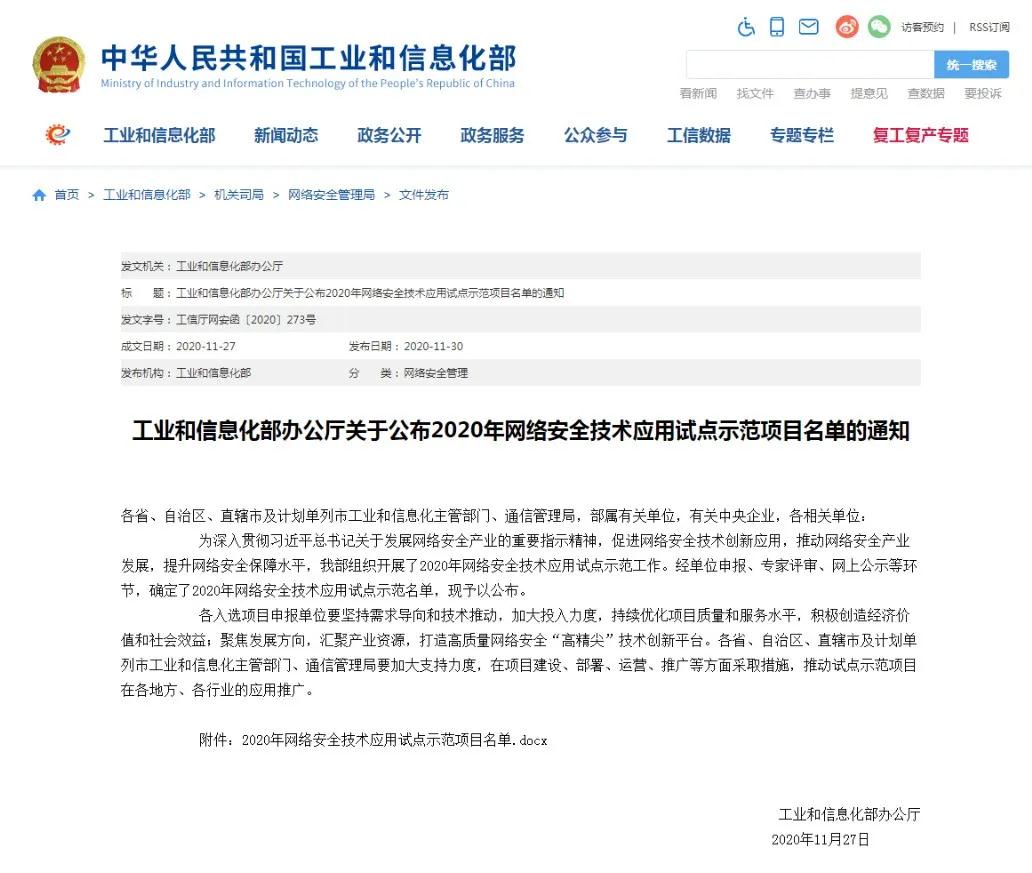 2020年网络安全技术应用试点示范工程由工业和信息化部主持开展,其目的在于深入贯彻习近平总书记关于发展网络安全产业的重要指示精神,促进网络安全技术创新应用,推动网络安全产业发展,提升网络安全保障水平。该项目以“引领网安新产业 建设安全新基建”为主题,围绕5G网络安全、工业互联网安全、车联网安全等十大新型信息基础设施安全类,安全防护、安全运营等四大网络安全公共服务类以及网络安全“高精尖”技术平台类等方向,经过单位申报、专家评审、网上公示等多个环节,最终遴选出具有创新性、先进性、实用性、可推广性的网络安全技术系统或平台,并对符合要求的项目开展试点示范。